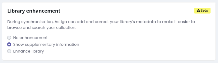In this build, following feedback, we've made library enhancement more configurable. You can now opt into "supplementary data" only, rather than the full enhancement experience:
